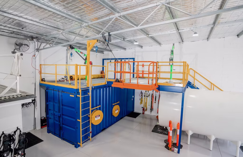 This state-of-the-art facility includes a modified shipping container and a steel mezzanine with stairs, simulating realistic confined space entry and emergency response scenarios for comprehensive safety training.